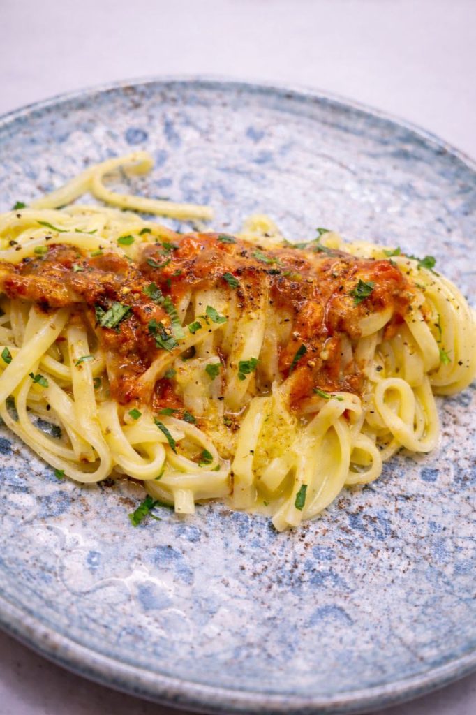Tagliolini freschi con pesto di pistacchio gambero rosso di Ortigia e stracciatella di bufala, uno dei piatti più rappresentativi della nostra cucina
